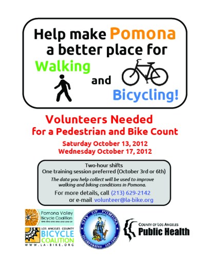 Numbers are great. They are loaded with tons of potential information and can make a great impact in spurring infrastructure changes. That’s why at PVBC, we are happy that the City of Pomona will begin conducting its first Bike Count with the help of the Department of Public Health. A bike count will help the city prioritize allocating funds on streets that are already serving bicyclists and pedestrians, to make improvements in those areas. PVBC has taken up the task to recruit volunteers interested in helping get accurate and reliable numbers. We can use all the volunteers we can get!